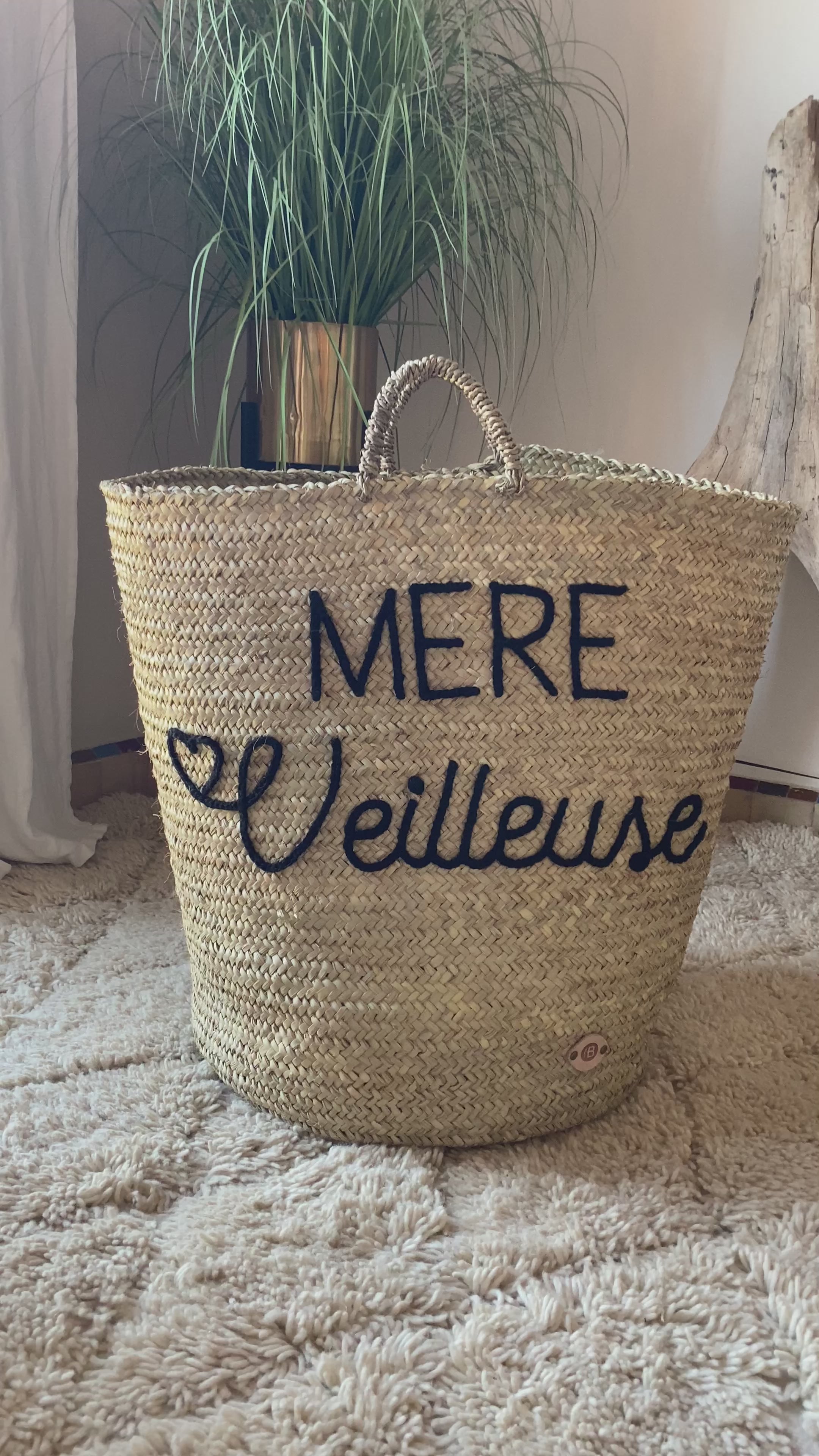 Panière de rangement en paille à personnaliser, Corbeille osier XXL, Panier à linge tressé, cadeau personnalisable Maman, fête des Mères, MERE Veilleuse !