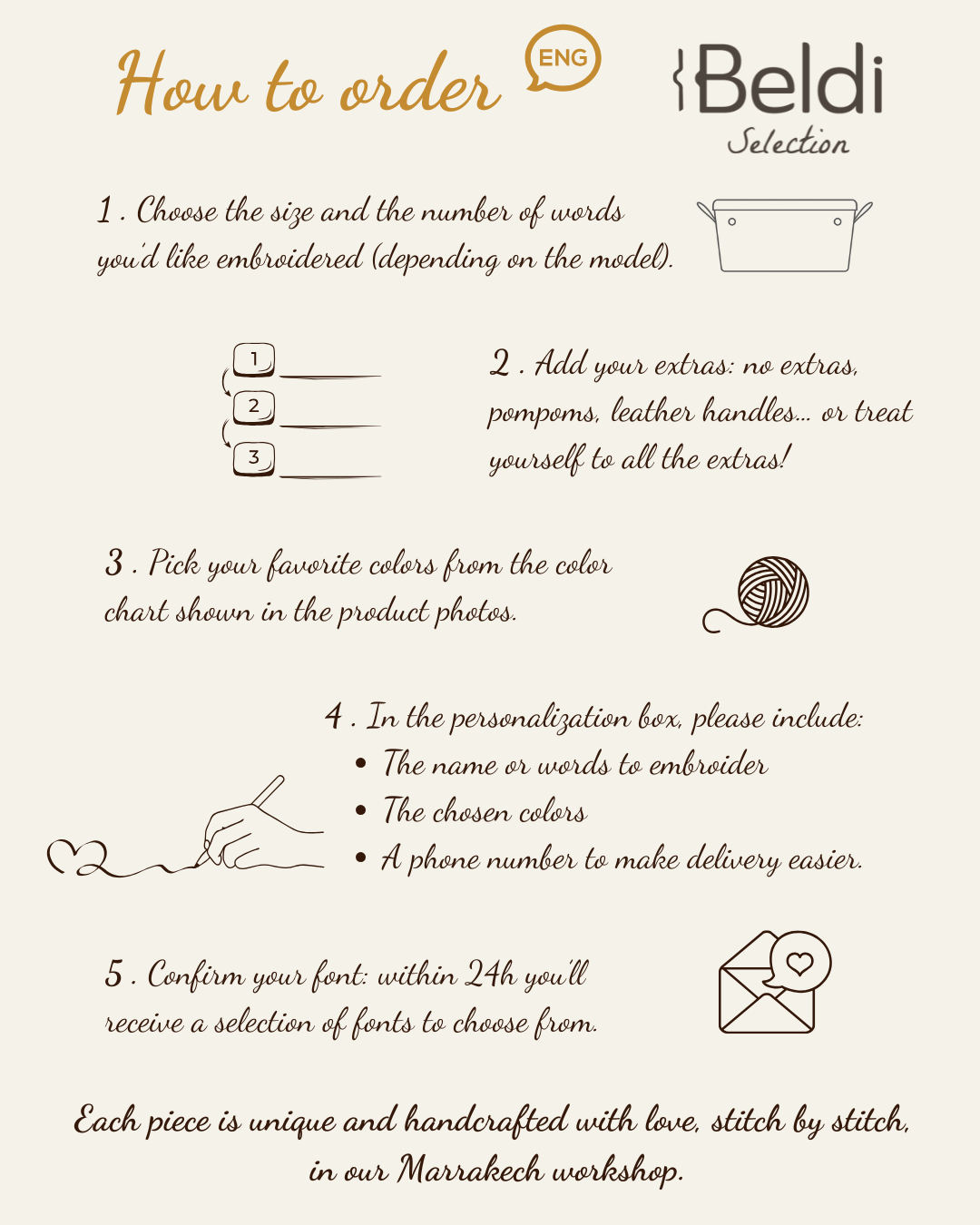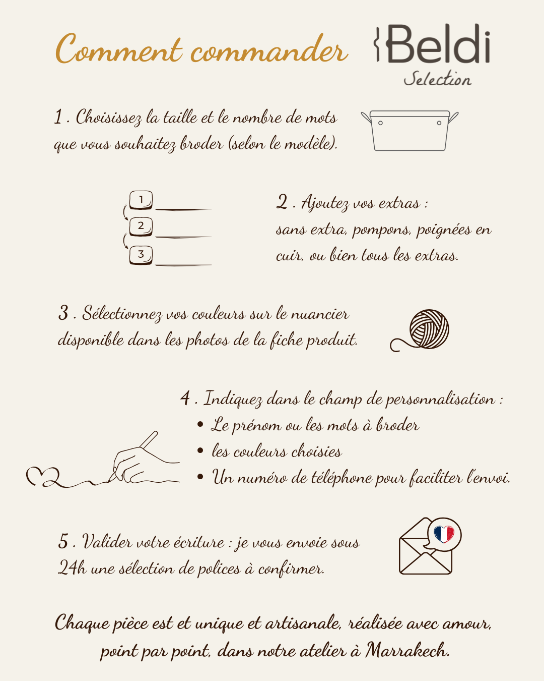 Beldi Sélection vous propose toute une gamme de produits 100% faits main, finement sélectionnés et sublimés avec soin, mettant en avant la qualité de la broderie, véritable empreinte de notre marque. D’un article classique tout droit sorti de chez l’artisan, nous aimons le rendre unique en mélangeant les matières et en y ajoutant ce petit détail qui fera toute la différence ! Telle est la signature de Beldi Sélection !